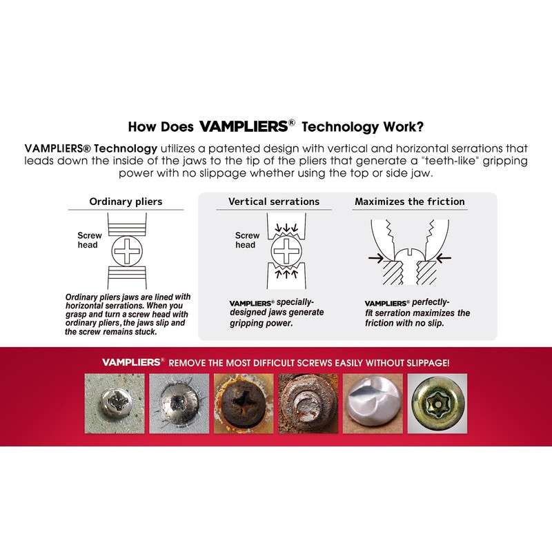 - VT-003-7LP: Vertical Serrations bite and grip a screw head without slippage. Gripping Vise remains closed securely while pliers are turned.