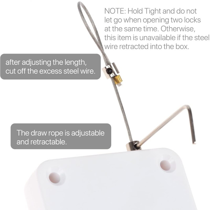 • Note: The draw rope is adjustable and retractable. When adjust the length. Please Hold Tight and do not let go when opening two locks at the same time. Otherwise, this item is unavailable if the steel wire retracted into the box. after adjusting the length, cut off the excess steel wire.