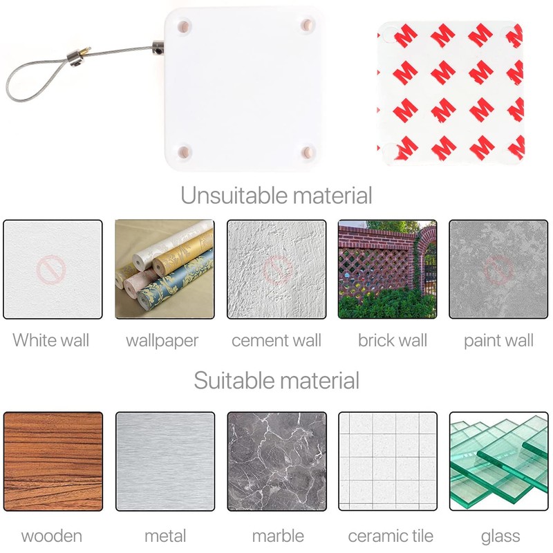 • Unsuitable material:White wall, wallpaper, cement wall, brick wall and paint wall. Suitable material wooden,metal, marble, ceramic tile and glass