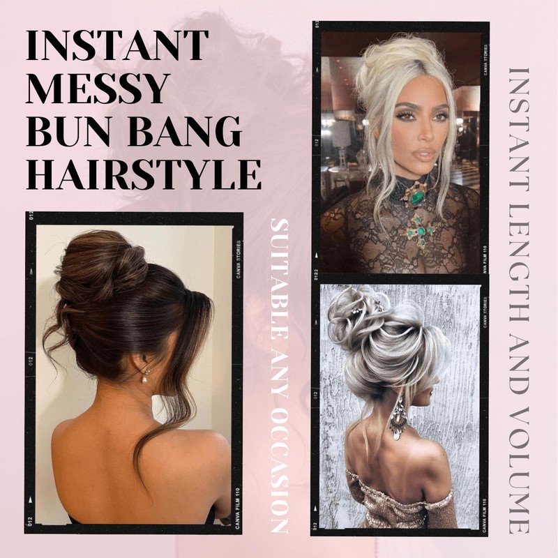 - DESIGN: Blone hair Bun & Bang clip-in for Women. Natural scrunchie long beard chignon buns hair pieces. Large claw chignon ponytail curly wave hair bun and bangs