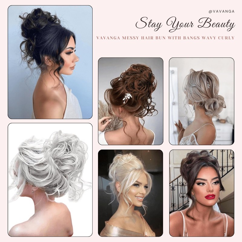 - ADVANTAGE: Synthetic hair large chignon bun with bangs hair extension for women. Curly hair bun tousled updo hair with long front side bangs bangs 2pc. Suitable for any occasion, Party, Daily, or Wedding
