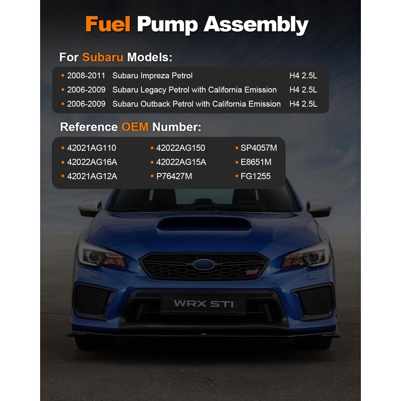 - [Vehicle Fitment]: Compatible with 2008-2011 Subaru Impreza H4 2.5L Petrol, 2006-2009 Subaru Legacy H4 2.5L Petrol with California Emission, 2006-2009 Subaru Outback H4 2.5L Petrol with California Emission GAS Wagon Sedan Hatchback 2.5i Basic 2.5i Limited L.L. Bean Edition 2.5i Premium 2.5i Special Edition 2.5i Touring Base Limited Outback Sport Premier Sport Touring Naturally Aspirated SOHC with Sending Unit.