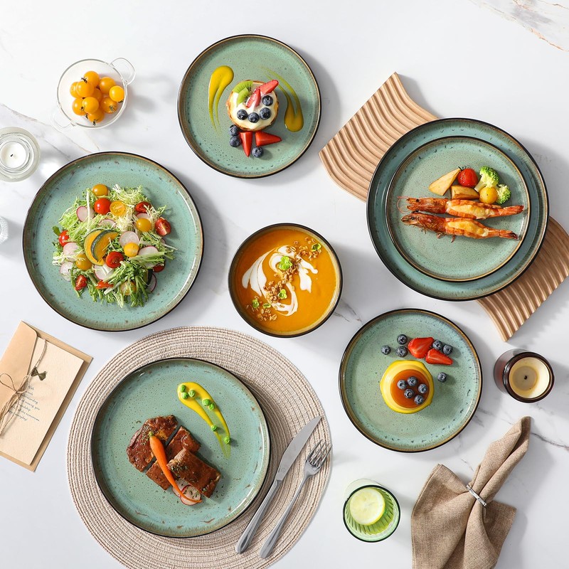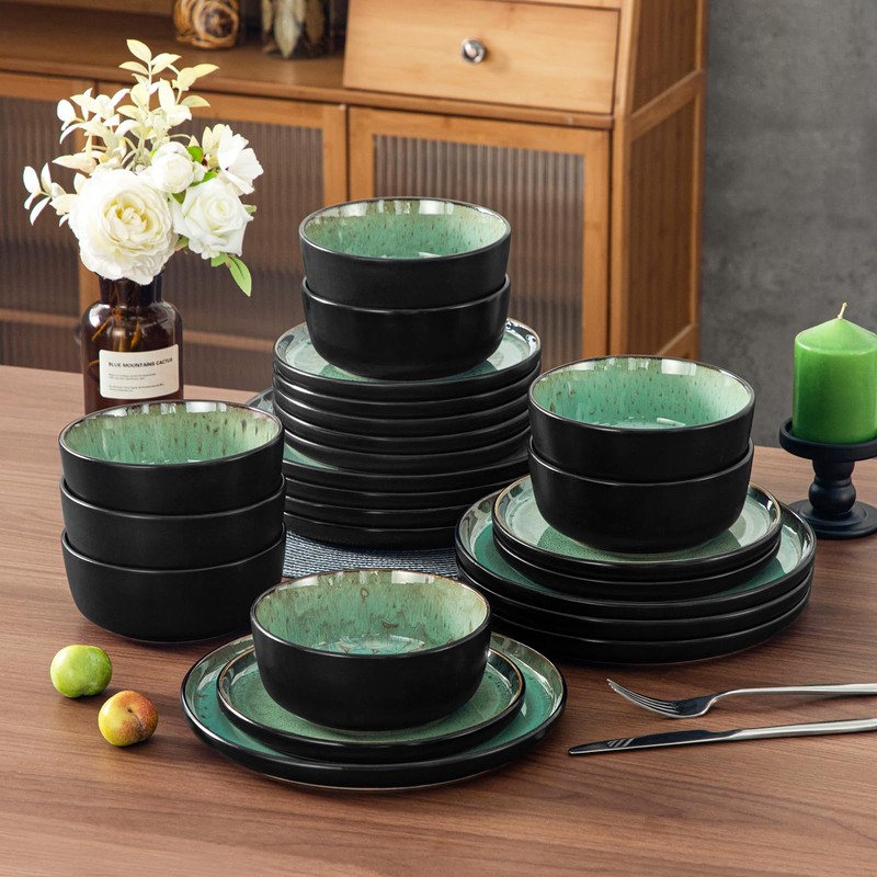 vancasso Plates and Bowls Sets, 24 Pieces Stoneware Dinnerware Sets for 8, Kitchen Dish Set Mircowave and Dishwasher Safe Dinner Set Ceramic Dishware, Turf Green, Series AMBER