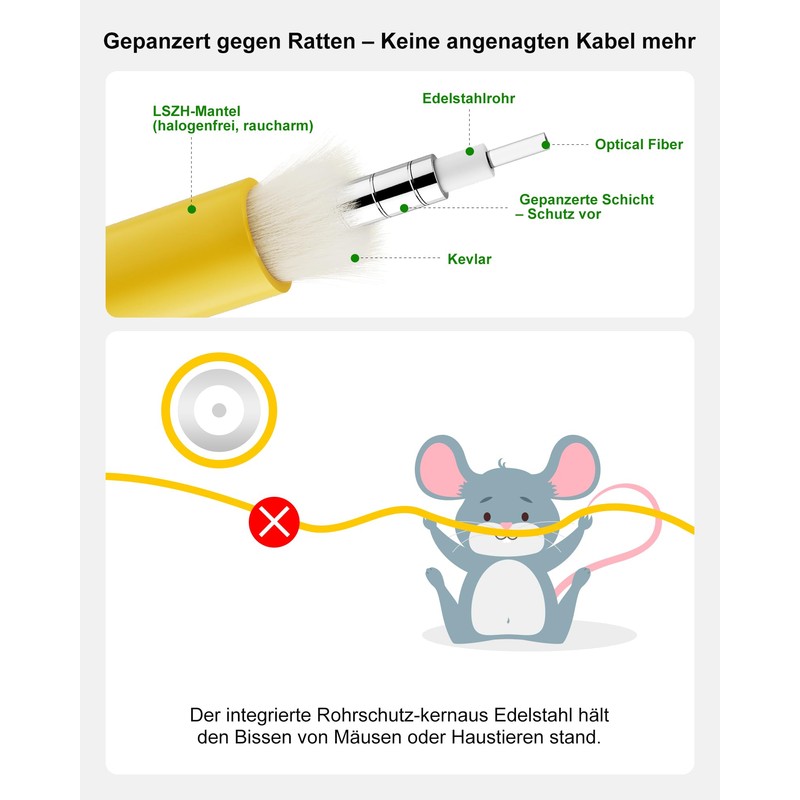 - Edelstahl-Armierung – Integrierte Edelstahlröhre schützt den Faserkern vor Biegen, Quetschen und Nagetierschäden und sorgt für langfristige Stabilität.