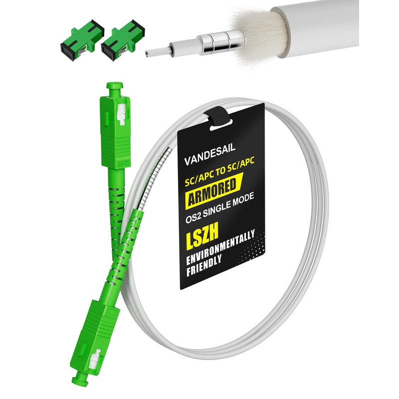 The VANDESAIL SC/APC to SC/APC Armored Fiber Optic Patch Cable (10M / 32ft) uses OS2 9/125μm single-mode fiber and is designed for FTTH, FTTB, FTTP, and CATV network extensions. The LSZH (Low Smoke Zero Halogen) armored jacket offers superior resistance to pressure, heat, and wear, ensuring stable performance in demanding environments. Compatible with Canadian ISPs such as Rogers, Bell, and Telus,Fiber Optic Cable is ideal for ONT relocation, indoor fiber re-routing, or device connections.