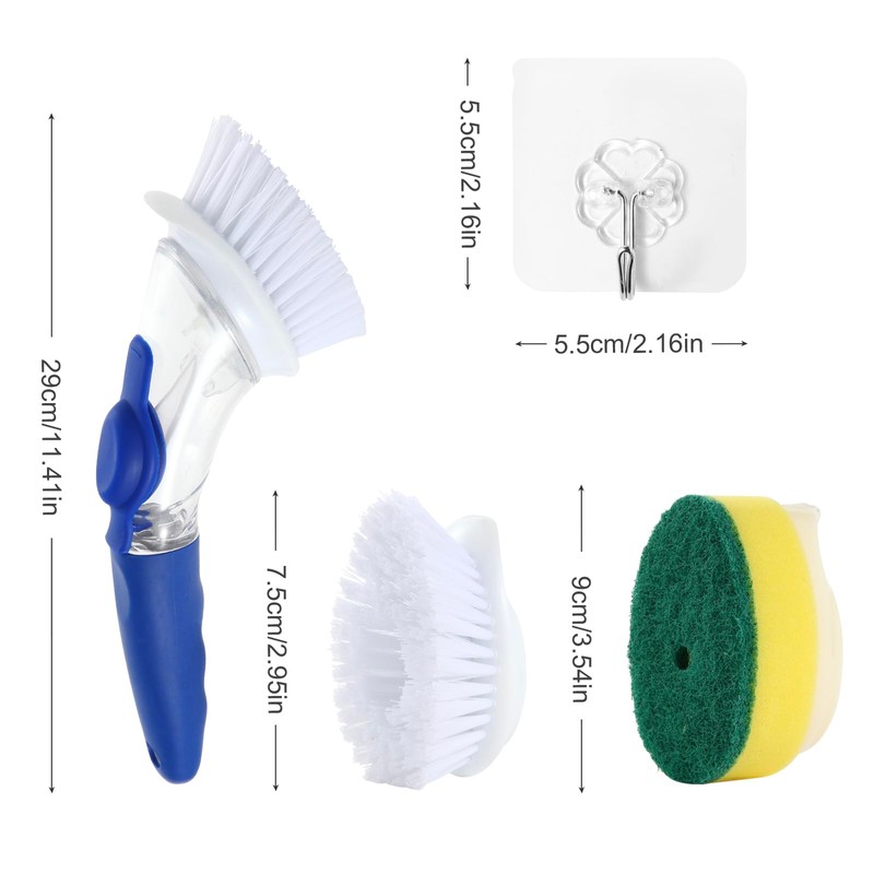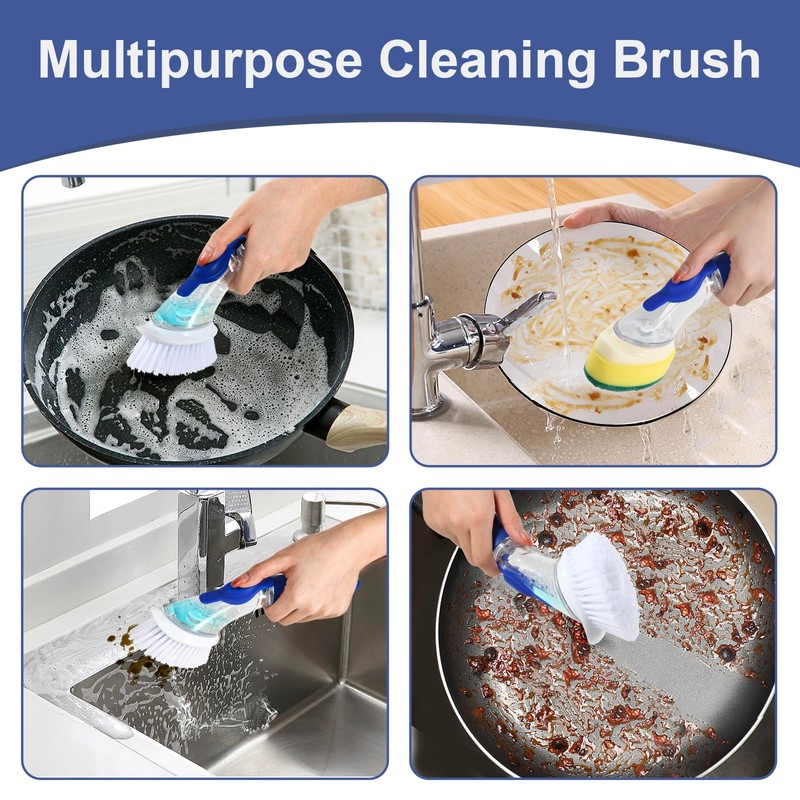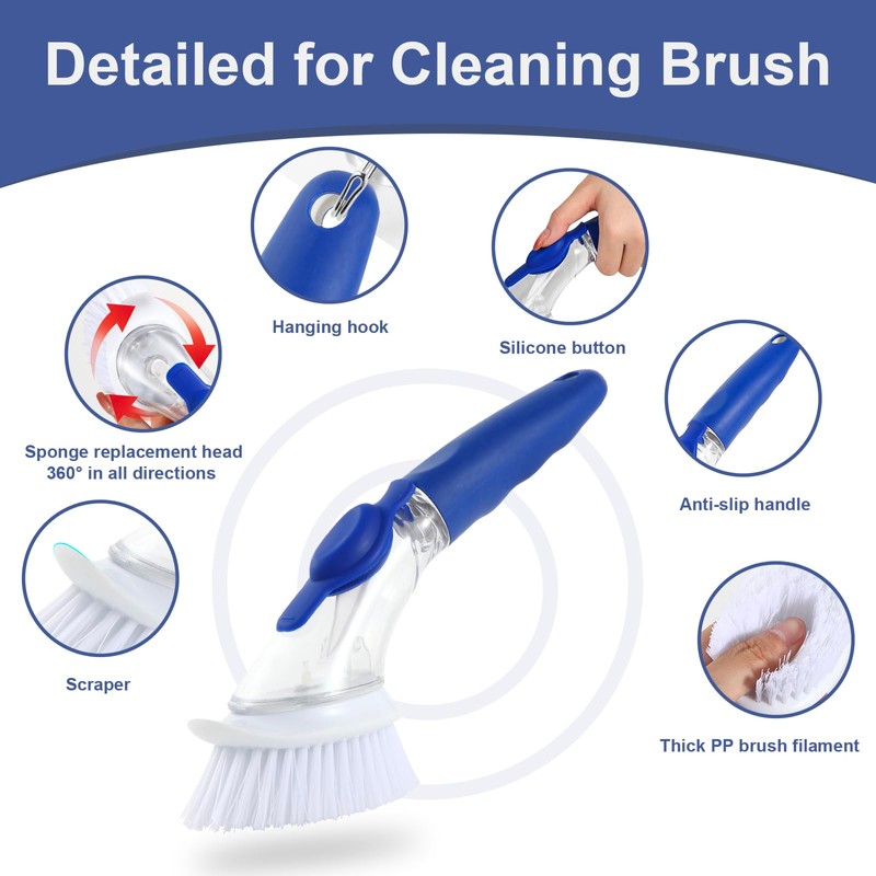Vandicka Spülbürste mit Spülmittelspender, Befüllbare Geschirrbürste, 2 Ersatzbürstenköpfe, Abrasionfrei, Befüllbare Spülbürste für Geschirr, Töpfe, Küchenspülen Reinigung, mit 2 Haken (Blau)