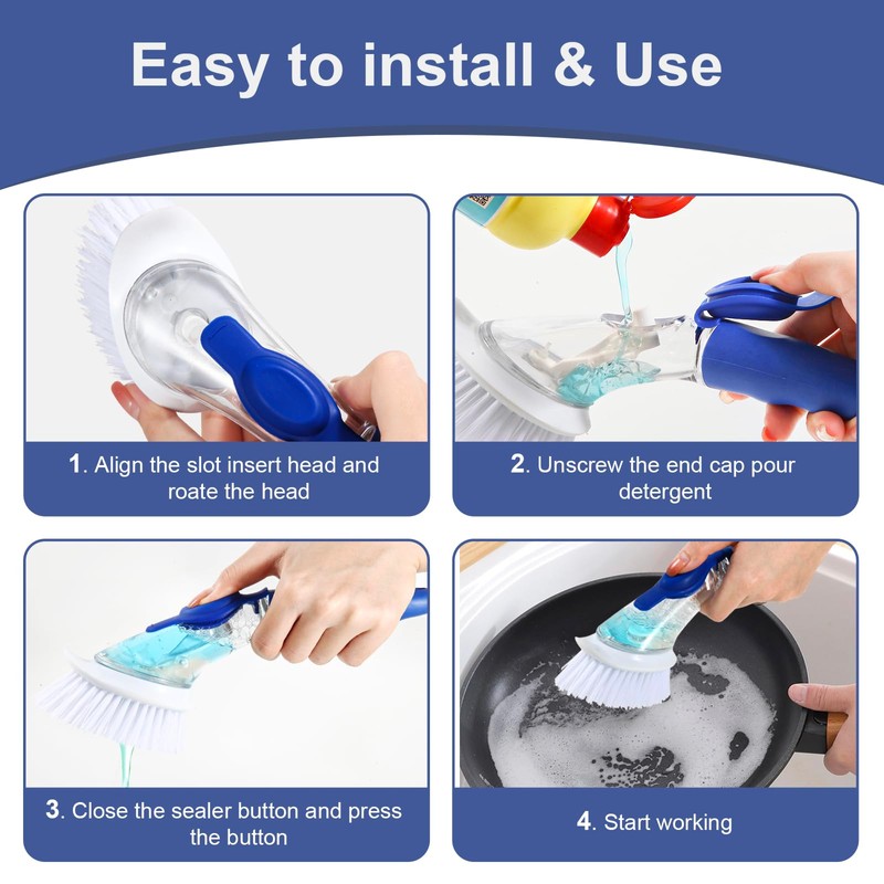 - Seifspengungsbürste: Mit unserem durchdachten Seifenpumpsystem können Sie Reinigungsmittel effizient nutzen. Drehen Sie einfach die Öffnung an der Oberseite des Griffs, um Ihr bevorzugtes Reinigungsmittel einzufügen. Drücken Sie dann den Gummi-Knopf in der Mitte des Griffs, um die optimale Menge des Reinigungsmittels abzugeben. Dies ermöglicht eine präzise Dosierung für alle Arten von Reinigungsmitteln, wodurch Sie nicht nur Geld sparen, sondern auch sicherstellen, dass Ihre Reinigungsarbeit gründlich und effektiv durchgeführt wird. Die starke Struktur des Griffs verhindert das Auslaufen des Waschmittels und sorgt dafür, dass jede Reinigungseinheit optimal genutzt wird.