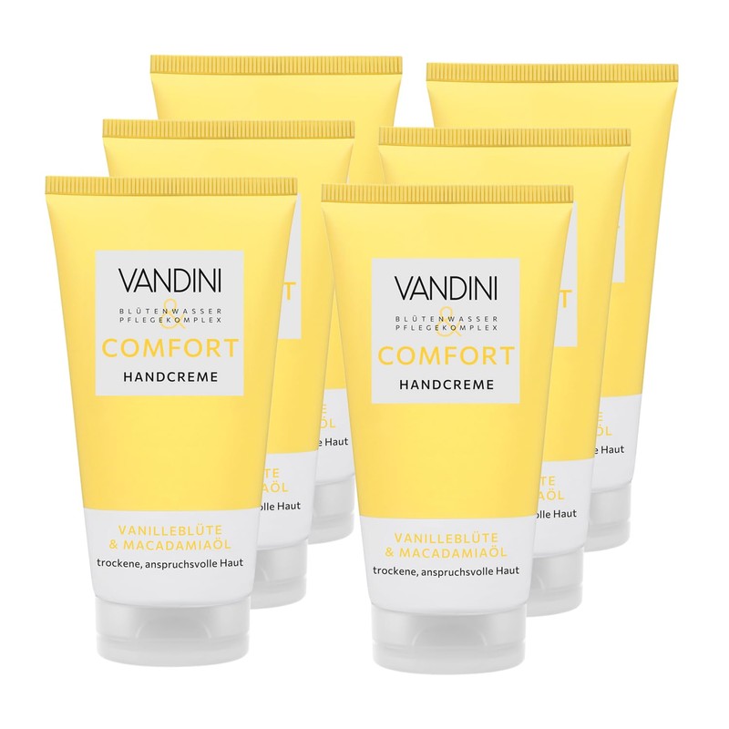 VANDINI 6x COMFORT Handcreme Damen 75 ml mit Vanilleblüte & Macadamiaöl - Handcreme für trockene, anspruchsvolle Haut - vegan, ohne Parabene & Silikone, dermatologisch bestätigt, Made in Germany