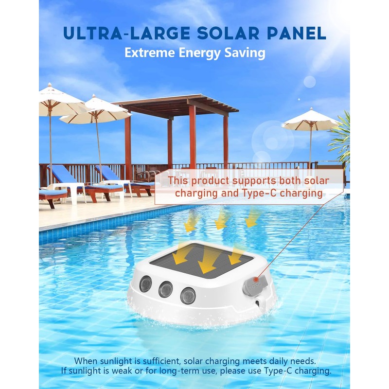 - [Dual Charging Modes] This pool thermometer supports two charging methods: a large solar panel for automatic charging under sunlight and a Type-C cable for fast charging. On sunny days, solar power is sufficient for daily use. If sunlight is weak or extended use is required, simply switch to Type-C charging. Note: Please turn off the device before charging with either method.
