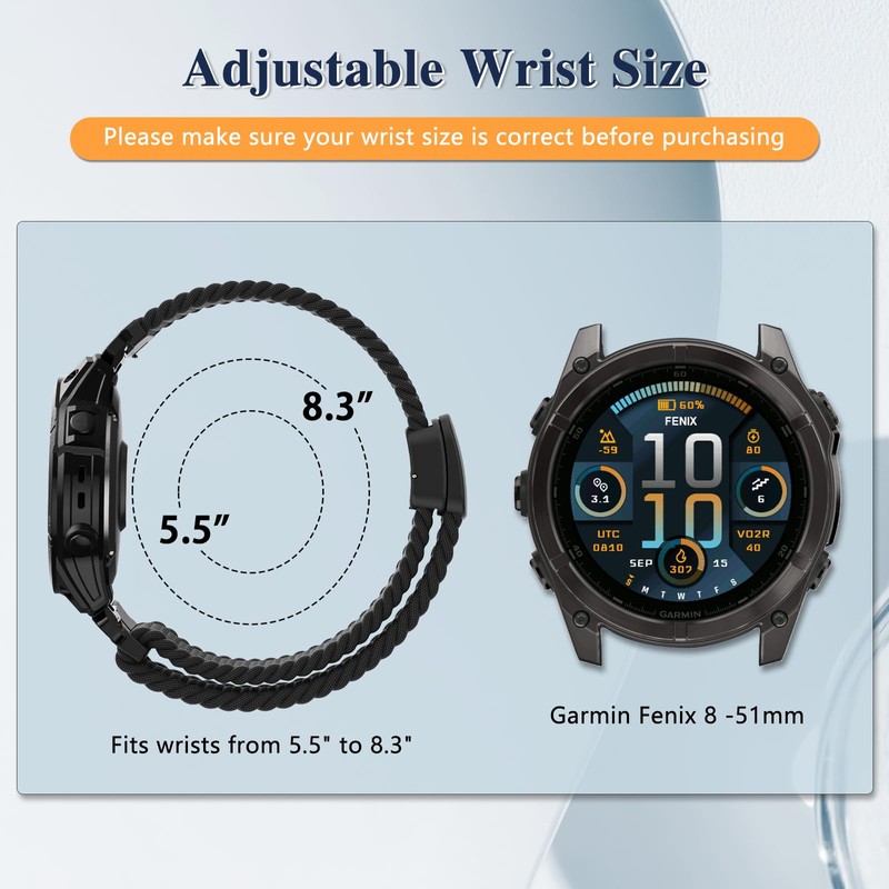 - Compatible Models: The Quickfit 26mm magnetic braided straps are compatible with Garmin Quatix 8 51mm/Garmin Tactix 8 51mm/Garmin Enduro 3/Garmin Fenix 8 51mm/ 7X Pro/ 7X/ 6X GPS/ 6X PRO/ 6X Sapphire GPS/ 5x Sapphire/ 5x GPS/ 5X Puls/ Fenix 3/Fenix 3 HR/ Fenix 3 Sapphire/ Instinct 2X/ TACTIX 7/ TACTIX DELTA/Enduro3/Enduro2/Enduro/D2 Bravo/Quaitx3/Descent Mk1/Descent Mk2/Descent Mk2i/COROS VERTIX2.Please confirm your smartwatch model before ordering