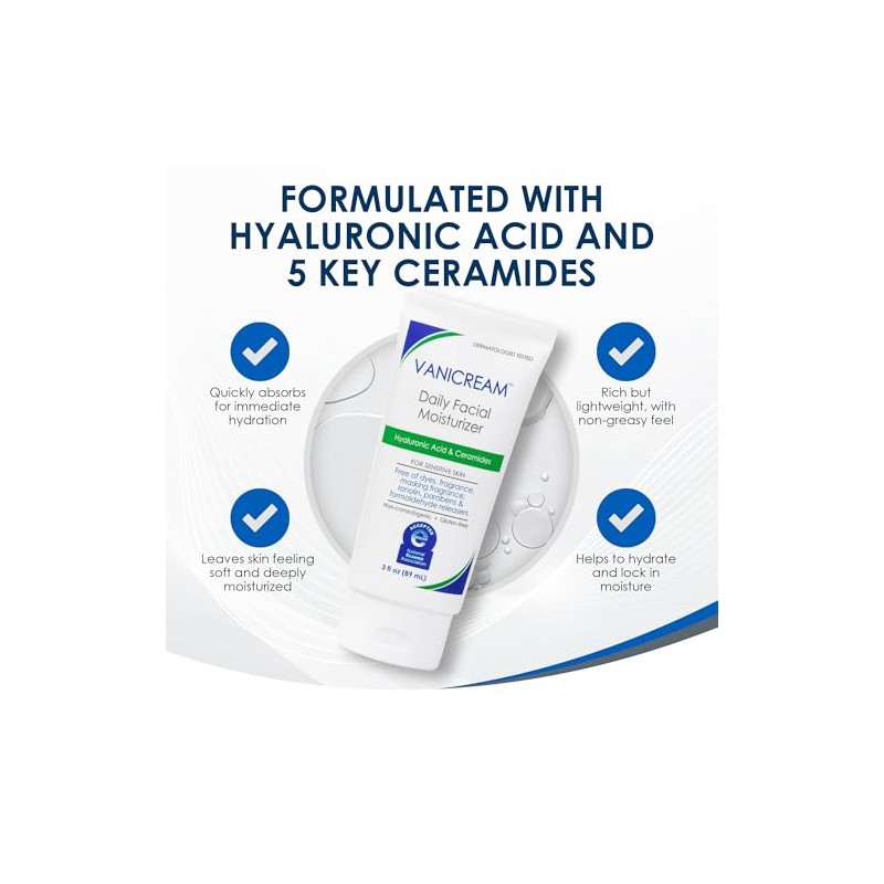🌟 💄 Vanicream Daily Facial Moisturiser, With Hyaluronic Acid, 5 Key Ceramides and Squalane, For Sensitive Skin, Fragrance and Gluten Free, pH-Balanced, Dermatologist Tested, 90ml 💄 🌟
