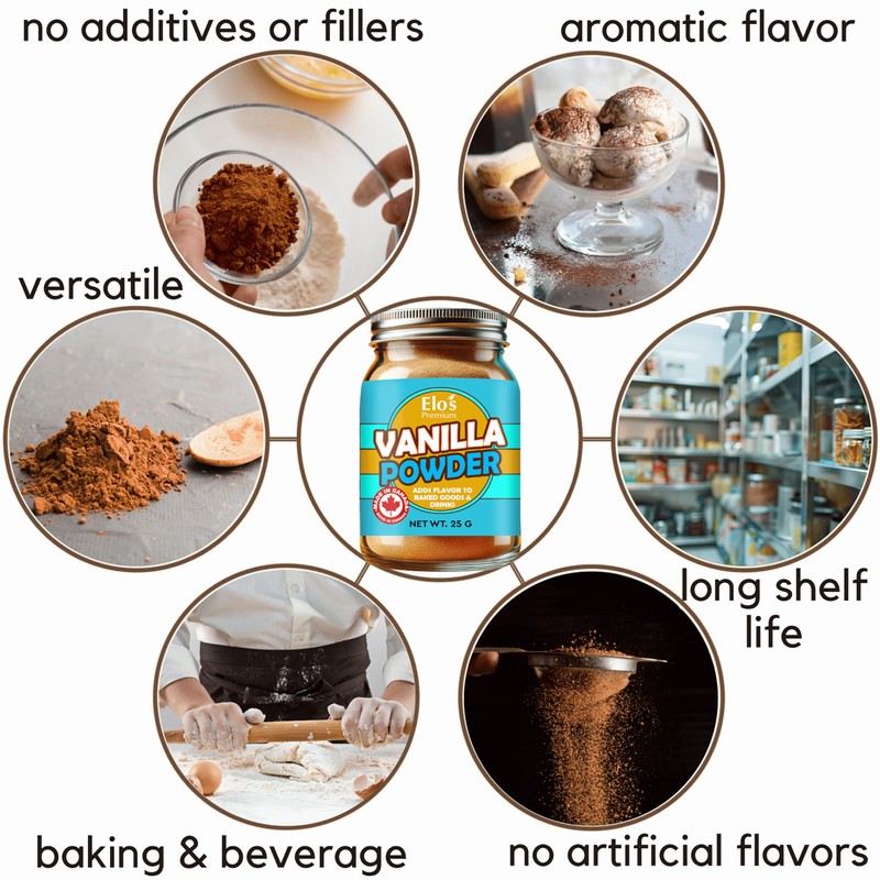 - 100% PURE VANILLA BEAN POWDER FOR RICH, GOURMET FLAVOR IN BAKING & COOKING Elo’s Premium Vanilla Bean Powder is made from high-quality, carefully ground vanilla beans, delivering a deep, natural vanilla taste without artificial ingredients.