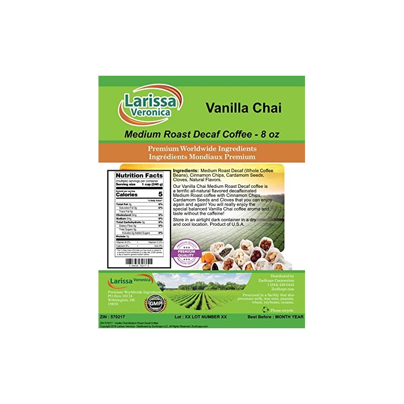 - Our Vanilla Chai Medium Roast Decaf coffee is a terrific all-natural flavored decaffeinated Medium Roast coffee with Cinnamon Chips, Cardamom Seeds and Cloves that you can enjoy again and again! You will really enjoy the special balanced Vanilla Chai coffee aroma and taste without the caffeine! - Ingredients: Decaffeinated Medium Roast (whole coffee beans), Cinnamon Chips, Cardamom Seeds, Cloves and Natural Vanilla Chai Flavor.