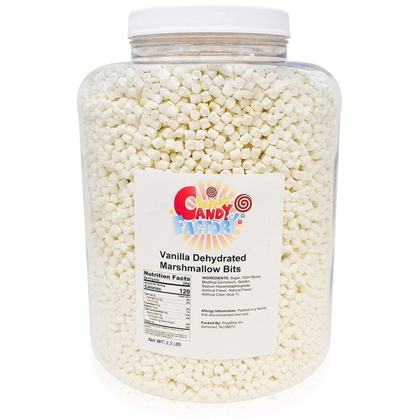 VANILLA MINI DEHYDRATED MARSHMALLOWS: Vanilla Dehydrated Marshmallow Bits in Jar 2.5 Pounds, fresh and delicious flavor. Great topping that can be easily added to a bowl of cereal or a steaming mug of hot chocolate. SARAH'S CANDY FACTORY: Made in the USA and repacked from bulk by Sarah's Candy Factory.