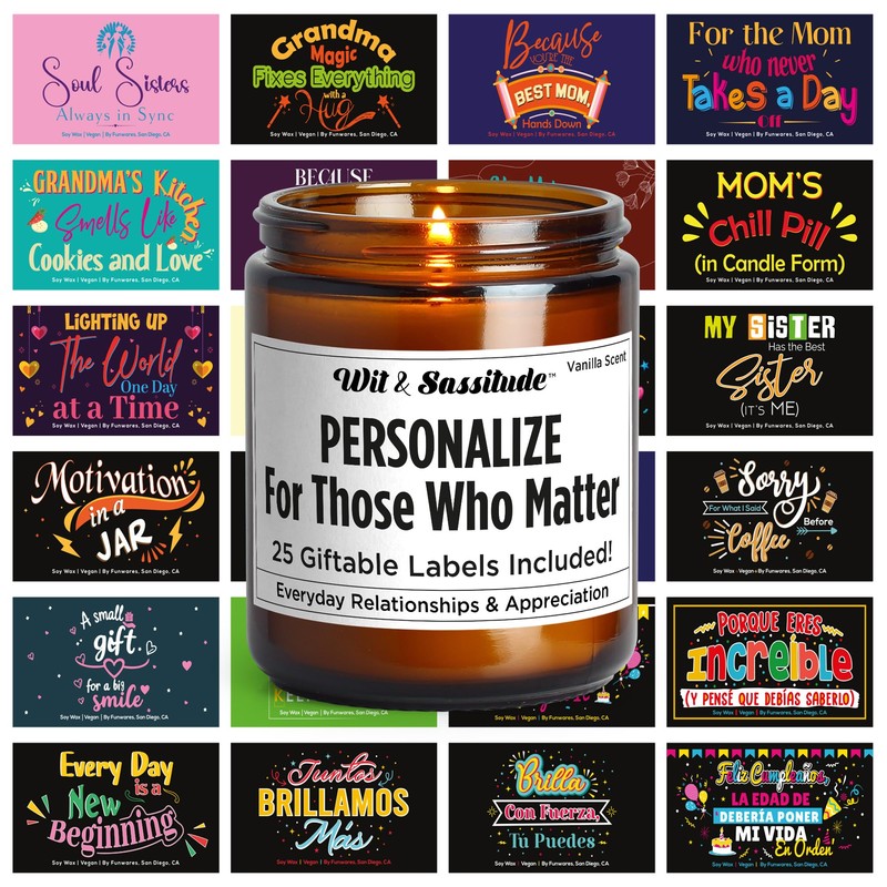 - 25 LABELS, 1 CANDLE – PERSONALIZE IN SECONDS: Choose from 25 warm, thoughtful messages to match the recipient and occasion. Includes Spanish label options for even more ways to express yourself. Apply the label in seconds for a customized, meaningful gift—ideal for birthdays, thank-yous, or just because.