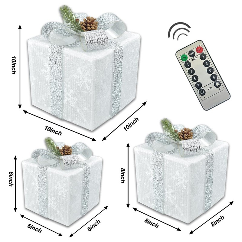 Set of 3 Christmas gift boxes includes: 2024 upgraded to a larger size-Small, 5.9" sq. x 5.9" H, Medium, 7.8" sq. x 7.8" H, Large, 9.8" sq. x 9.8" H. Equipped with light remote control, Built with 50 LED warm lights to easily light up your room. 8 lighting modes and IP44 memory function. The battery box design allows you to take the llight up gift box wherever you want to decorate!