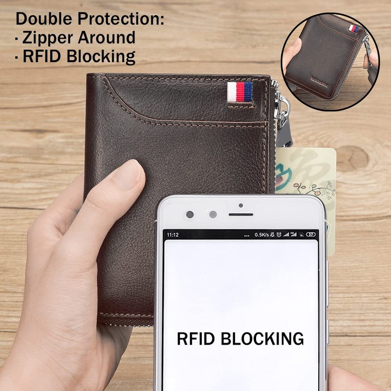 VANNANBA Mens Genuine Leather Zipper Wallet RFID Blocking Bifold Zip Around W...