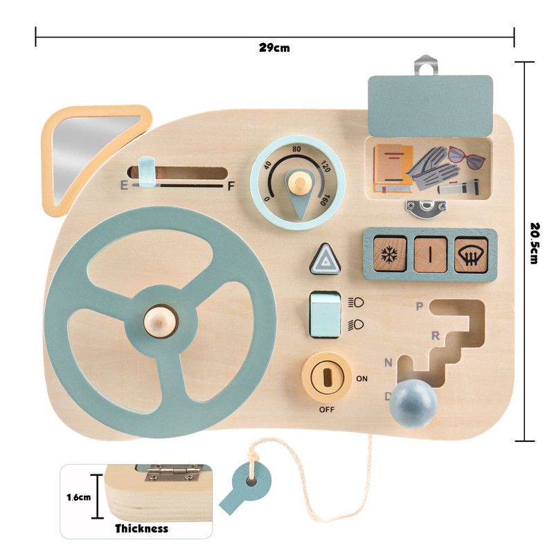 - Busy board steering wheel children: includes key start, gear shifter, steering wheel rotation, horn, adjustable headlight and mirror, safety warning signal. Montessori activity board for 2 3 4 year girls boys.