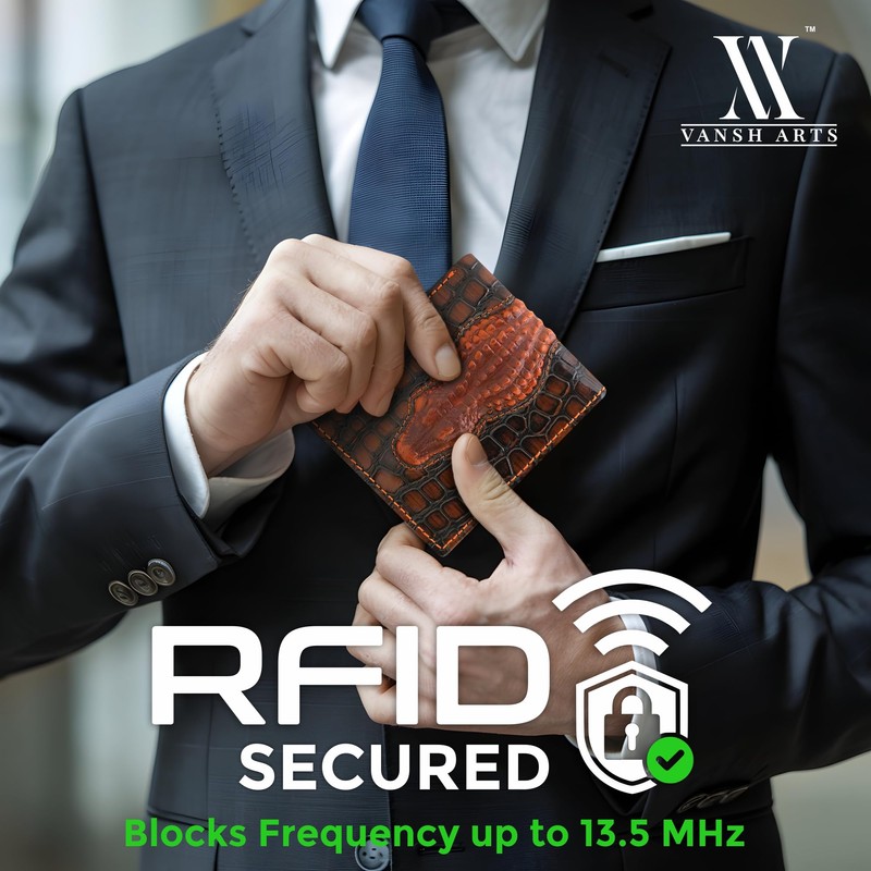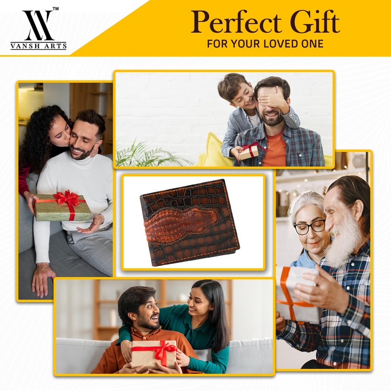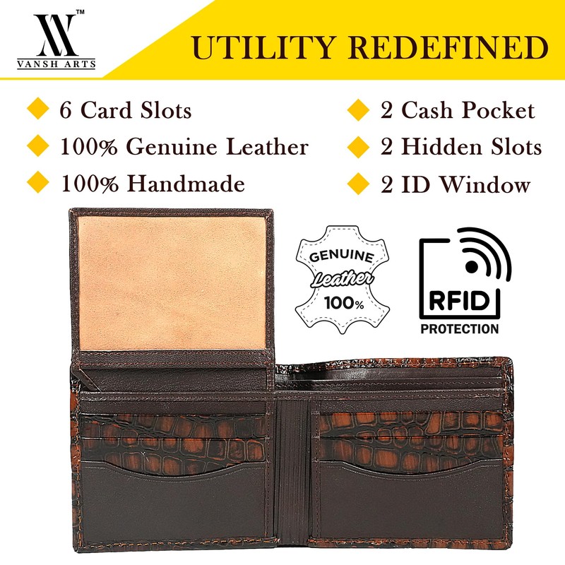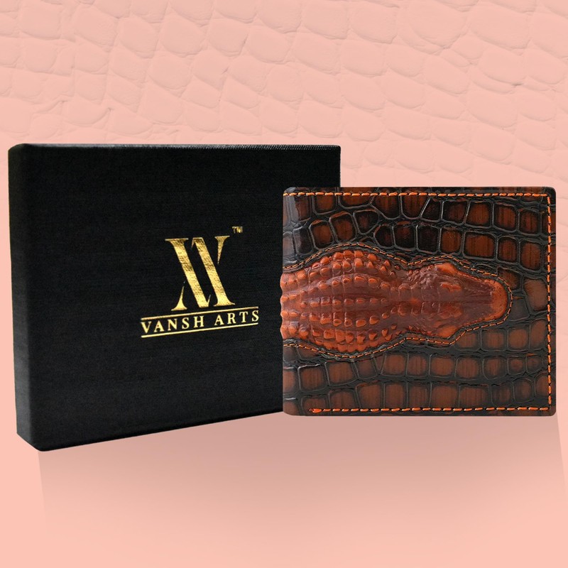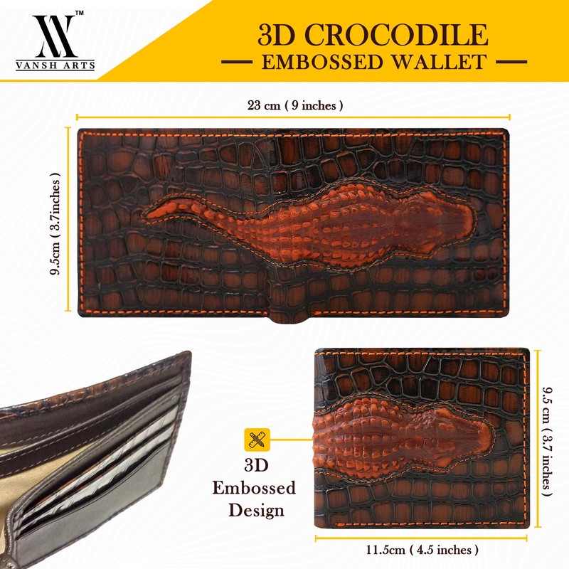 VANSH ARTS Men's RFID Blocking Leather Wallet - Luxurious Handmade Crocodile Pattern Bifold with 3D Embossed Design, Premium Full Grain Leather, 6 Card Slots (Dark Brown)