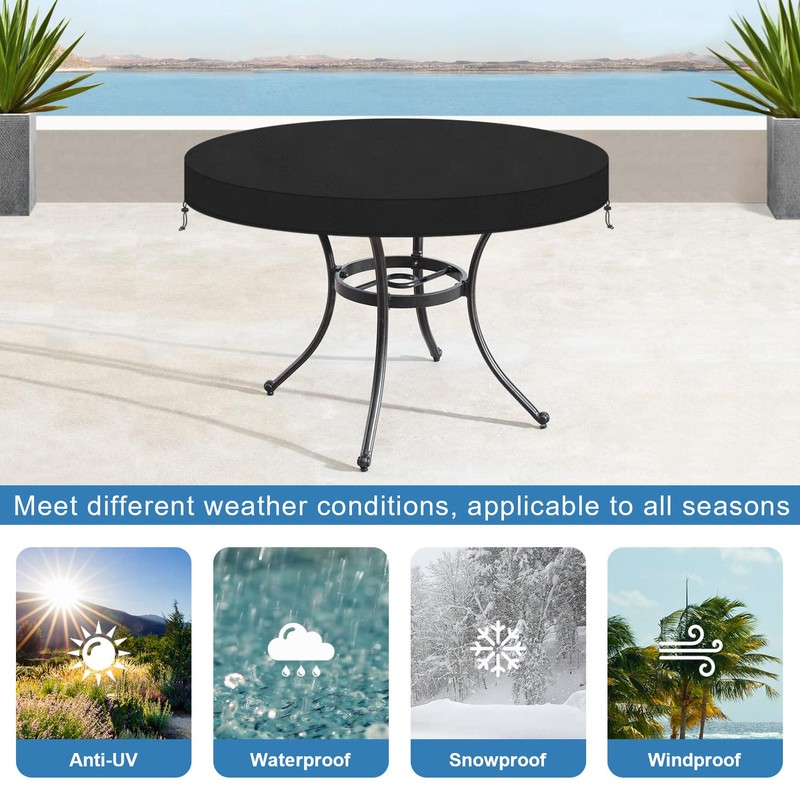 - [420D Oxford Fabric Durable Material] The round patio table top cover is heavy duty oxford polyester with a thick coating of PU which is waterproof, weatherproof, dust-proof and UV resistant.The cover with PU performs better than PVC's as it is more durable, heat and rip resistant, softer and more comfortable