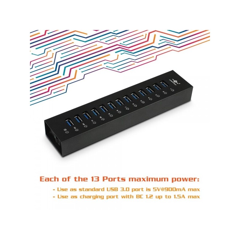 13-Port USB 3.0 Aluminum Hub (All Data/Charging BC 1.2), 12V/5A Premium Power Adapter