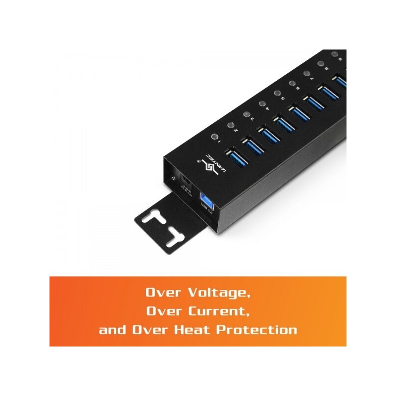 The Vantec Link 13-Port USB 3.0 Aluminum Hub is a simple and easy to use hub loaded with many features. This ergonomically designed Hub uses strong but light-weight machined aluminum casing for toughness. It can be placed on the office desk, mounted on the wall/desk (comes with mounting kit), or in a production setting in factory or rack using DIN mount. It is easy to connect and charge USB devices; consolidate them together in one convenient place on your workspace. All 13 SuperSpeed ports support Data/Charging BC 1.2 up to 1.5A designed for the fastest charging and still enables access to your data simultaneously. This Hub with its Certified Power Adapter gives you the ability to connect and load up the 13 ports to use a mix of low power and high Power devices. It also provides over voltage, over current and overheat protection. When not in use, this energy efficient power adapter sips very little power to save energy and when using with the latest OS, the USAP function further enhances the SuperSpeed USB capability. This Plug and Play hub will simplify, save time and help speed up data transfer between your devices.