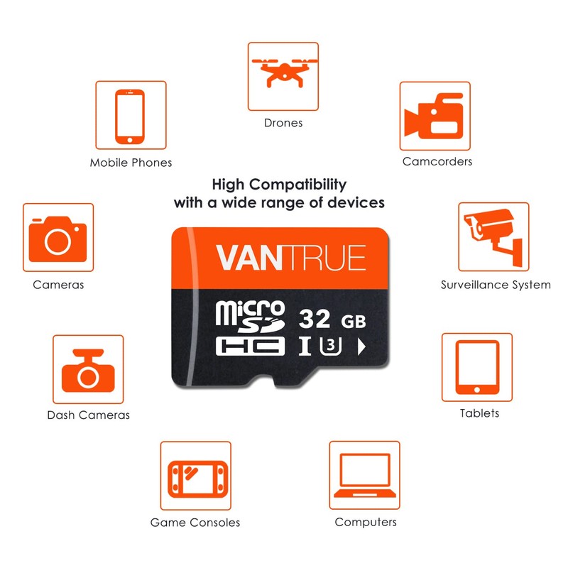 - Included SD Adapter: The 32GB Vantrue Ultra microSDHC UHS-I Memory Card could work with any device that has a microSDHC card slot.