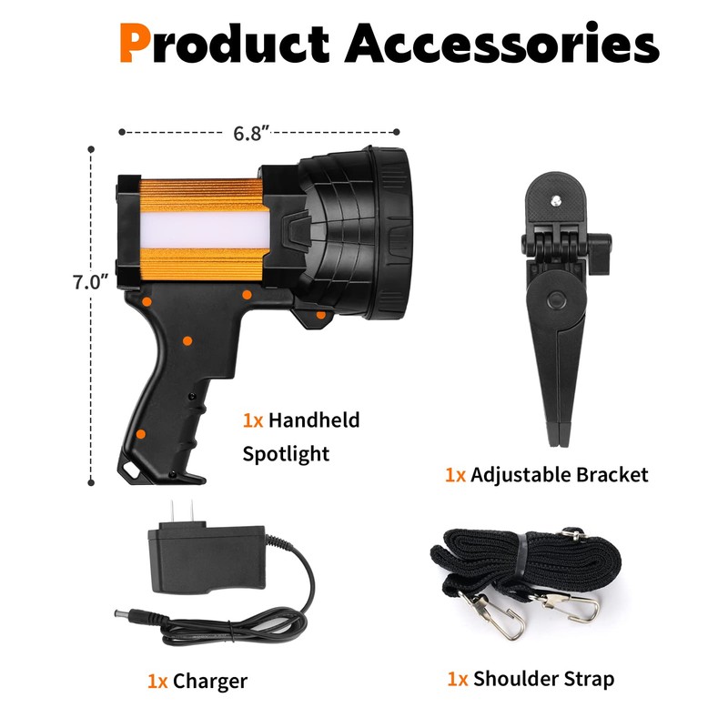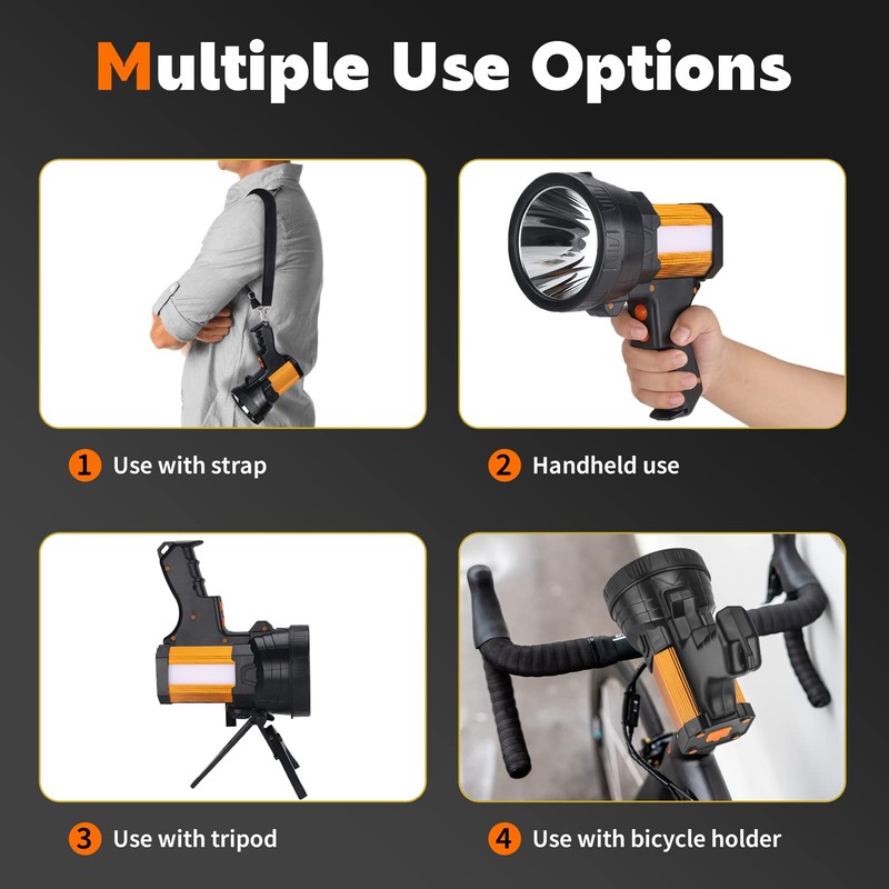- Multiple Use Options: When you walk a dog, the shoulder strap can prevent the rechargeable spotlight falling. The adjustable bracket suit for camping, night fishing and barbecue, perfectly free your hands.