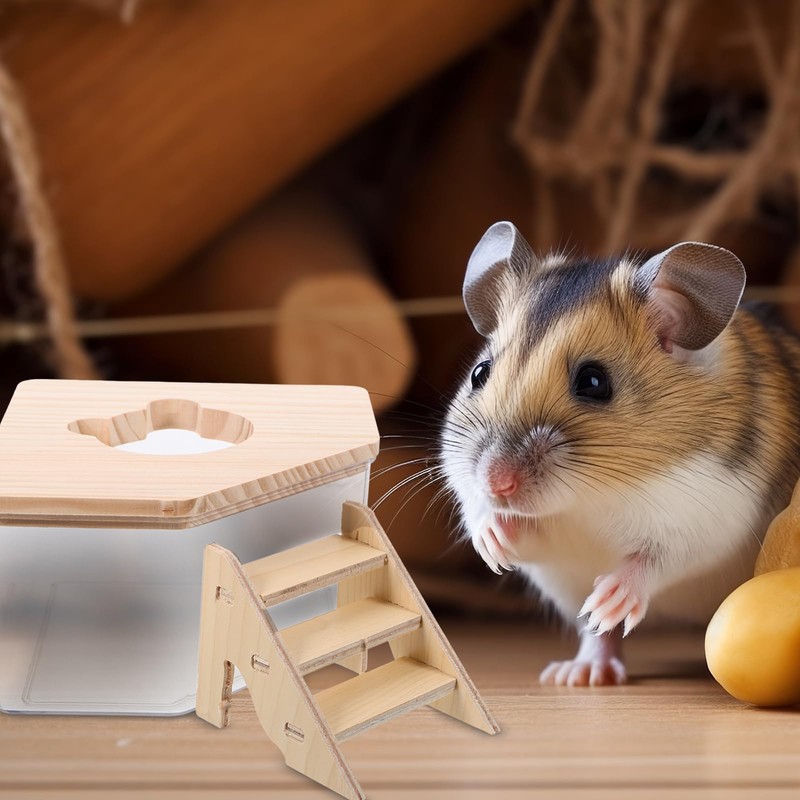 - Ladder design: This sand bath container is equipped with a ladder to facilitate the hamster to enter and leave the sand bath area. It provides a convenient passage, allowing hamsters to freely enter and exit the sand bath container, increasing their activity space and fun