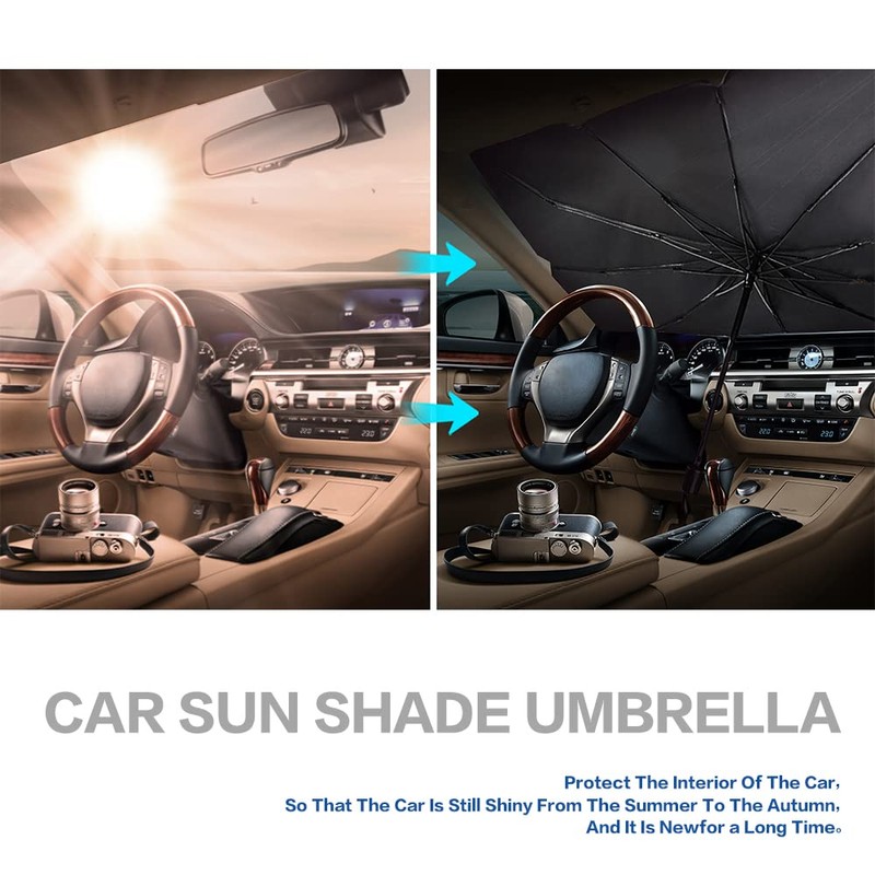 - 【Foldable Design】Umbrella-type car windshield sunshade works like ordinary umbrellas, the sturdy frame and stable support ensure the durability of this car sunshade. This foldable windshield umbrella is really cool.