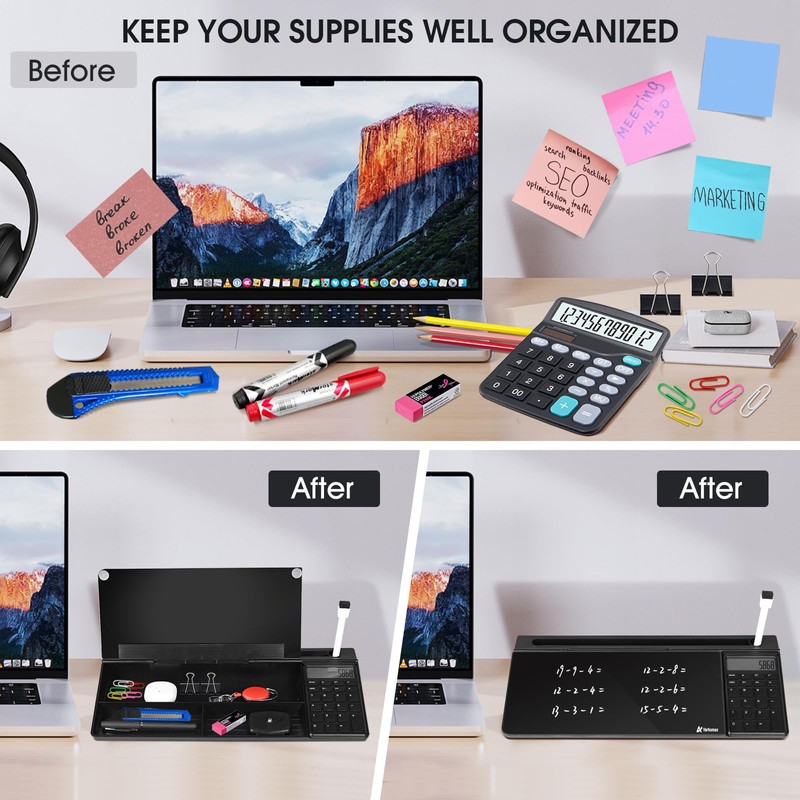 - Removable Calculator: This desk glass white board with removale calculator is an excellent creativity booster for your daily office. The upgraded 12 digit standard functional calculator with LCD display is also an aultimate tool for homework