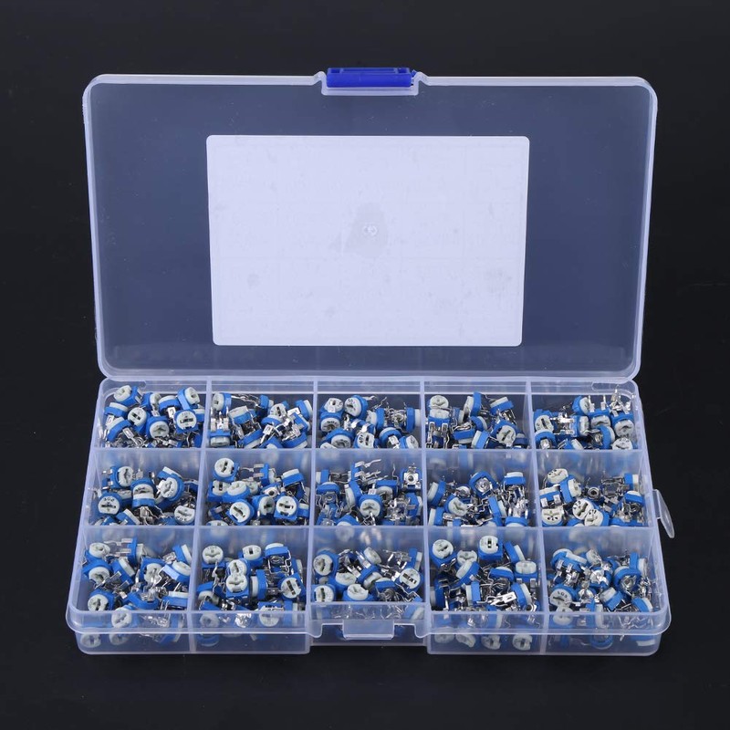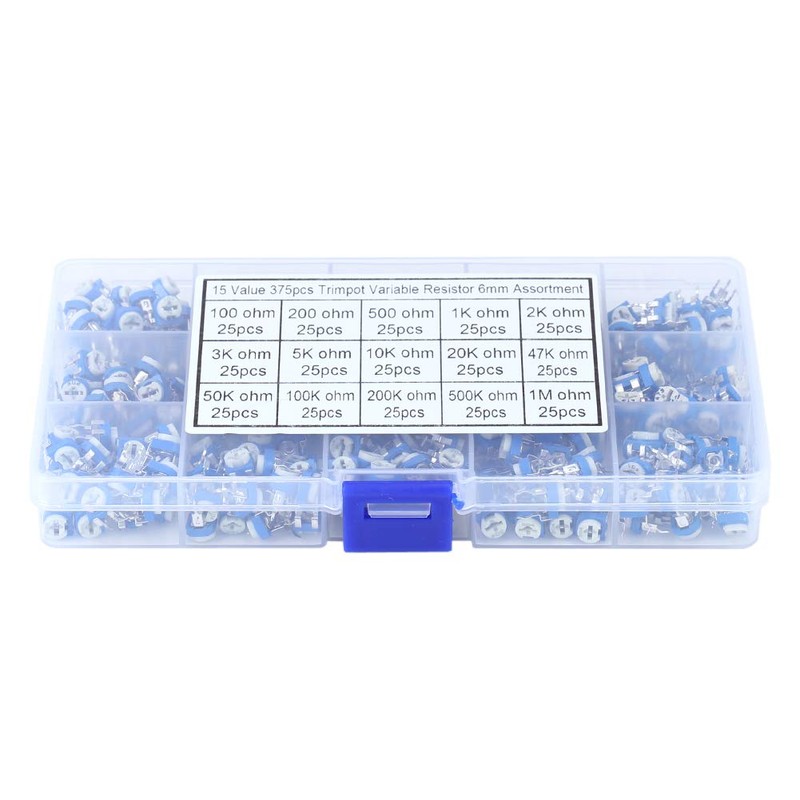 Variable Resistor Kit, 15 Values, 100 Ohm-1 Mohm, Trimmer Potentiometer Assortment Kit with Box, 375 Pieces