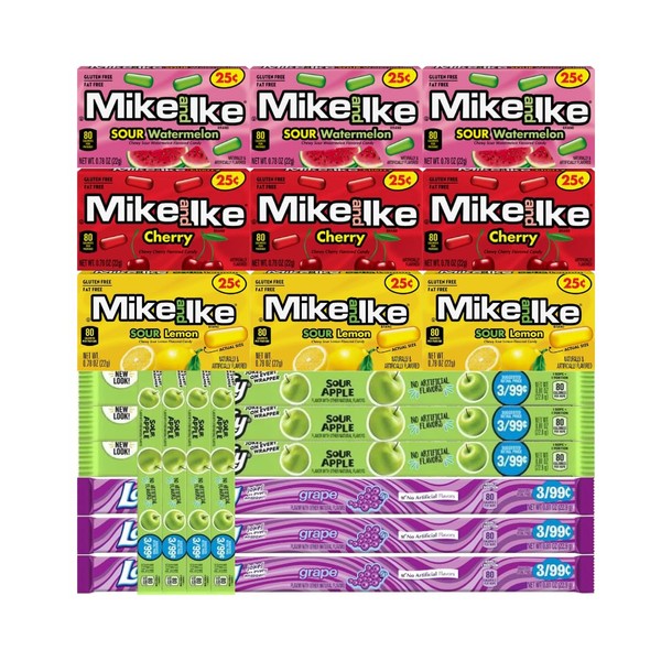 This irresistible assortment features the best of both worlds: Mike and Ike candies and Laffy Taffy Ropes. With three of each flavor included, this mix is sure to please every palate. Experience the tangy zest of sour watermelon, cherry, sour lemon, sour apple, and grape—all individually wrapped to maintain freshness and provide convenience.