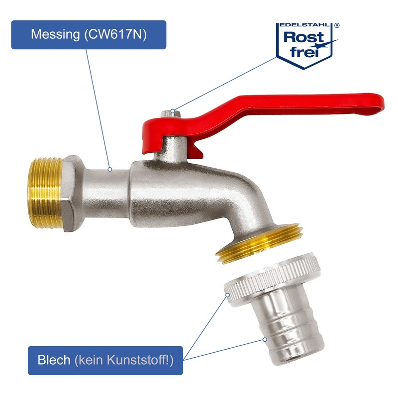 - Solid and robust ball drain valve made of brass with a 3/4 inch wall connection and a red steel lever. Suitable for indoor and outdoor use. Comes with a matching hose fitting.