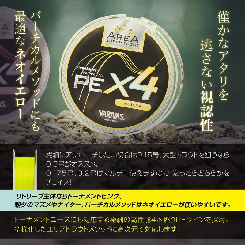 - Model: PE X4 [Neo Yellow]... Ultra fine 4-braid PE line with outstanding visibility that does not miss a slight bite. The Neo Yellow is perfect for laughs and nights, and vertical methods that focus on visibility without missing a small rattle