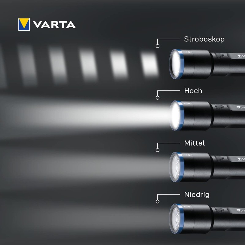 - Four light modes (high, medium, low and strobe mode). With a light range of up to 300 m and a light output of up to 700 lumens, the light breaks through the night. The running time is up to 24 hours