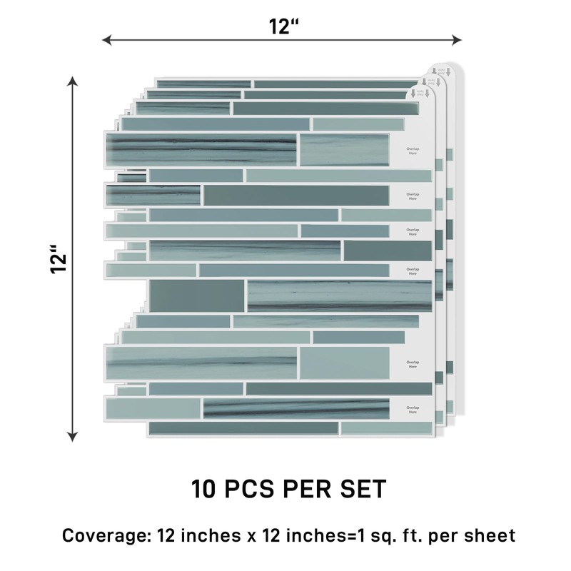 - Size & Material: Each tile measures 12''x12'', thickness is 0.05'', 10 sheets per pack, total covers about 10 square feet. Staggered blue tiles design, white grout, classic style. Realistic tile effect with 3D texture. Made of premium vinyl, glossy finish, flexible, light weight, durable, not easy to crack, not fade over time