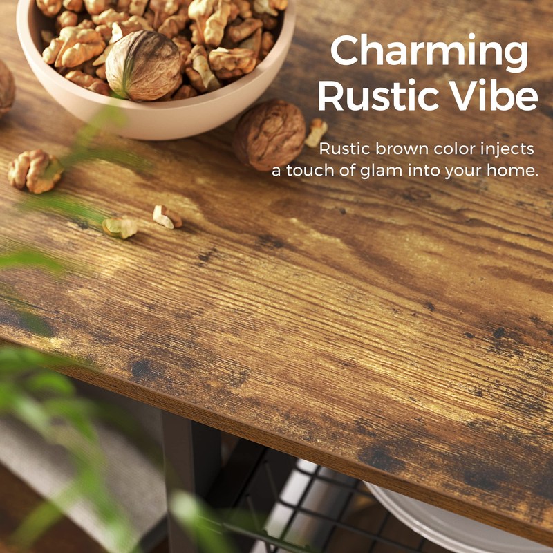 Product description Color:Rustic Brown With our new "VASAGLE" kitchen shelf in trendy vintage style, you can create exactly what the designers had in mind: a relaxed and pleasant atmosphere in the midst of your home. A Powerful Kitchen Helper The classic, stylish look of this all-purpose shelving may be misleading in that, believe it or not, it can actually carry up to 176 lbs in total weight. Heavier items like your microwave, stacks of cookbooks, or piles of pots and pans will all find a spot here on the various shelves. Microwave, mini oven, and spices Five shelves arranged at different heights, a pull-out wire basket and six S-shaped hooks provide space for various kitchen utensils, recipes, spices, pasta boxes or dry towels. This compact piece of furniture is a real all-rounder - the only downside is that it can't fly. Yet. Specifications: - Color: Rustic Brown - Material: Particleboard and Metal - Product Size: 35.4”L x 15.7”W x 33”H (90 x 40 x 84 cm) - Weight: 42.3 lb (19.22 kg) - Max. Total Load Capacity: 176 lb (80 kg) Package Contents: - 1 x Kitchen Shelf - 1 x Accessory Bag - 1 x Instructions VASAGLE Note: - Avoid placing food directly on the metal wire basket for food hygiene reasons.