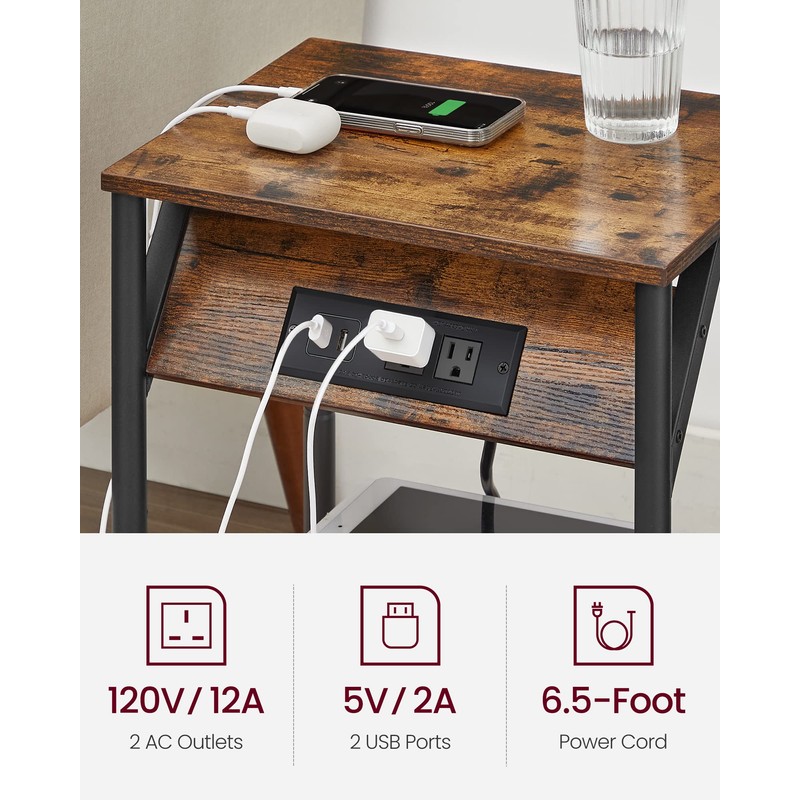 - [Side Table with Charging Station] Low battery? Charge your devices with this small table featuring two AC outlets, two USB ports, and a 6.5 ft cord. Also, the proper distances between outlets ensure you can use all of them at the same time