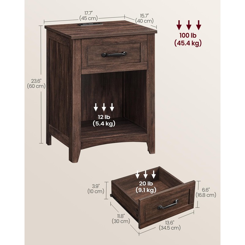 VASAGLE Farmhouse Nightstand with Charging Station, Bedside Table with Drawer, Open Compartment, Side Table with Storage, for Bedroom, Maroon Brown ULET659K51