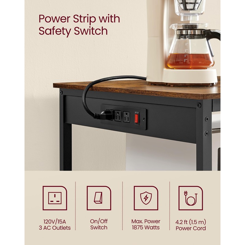 - [Convenient Power Strip] This baker's rack features a built-in power strip with 3 AC outlets, a safety switch, and a maximum power capacity of 1875 watts. It's perfect for powering multiple appliances at once