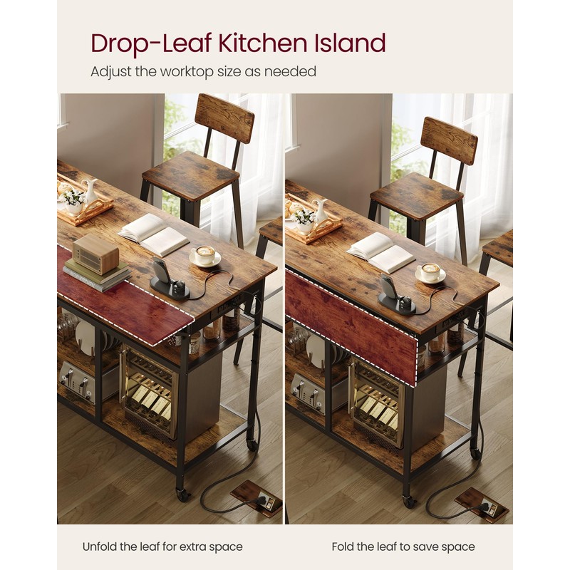 VASAGLE Kitchen Island with Drop Leaf, 47.2" Width Rolling Kitchen Cart with Power Strip, Extendable Worktop, Workbench,Pegboard, Adjustable Shelf, Rustic Brown and Ink Black UKKI013K01