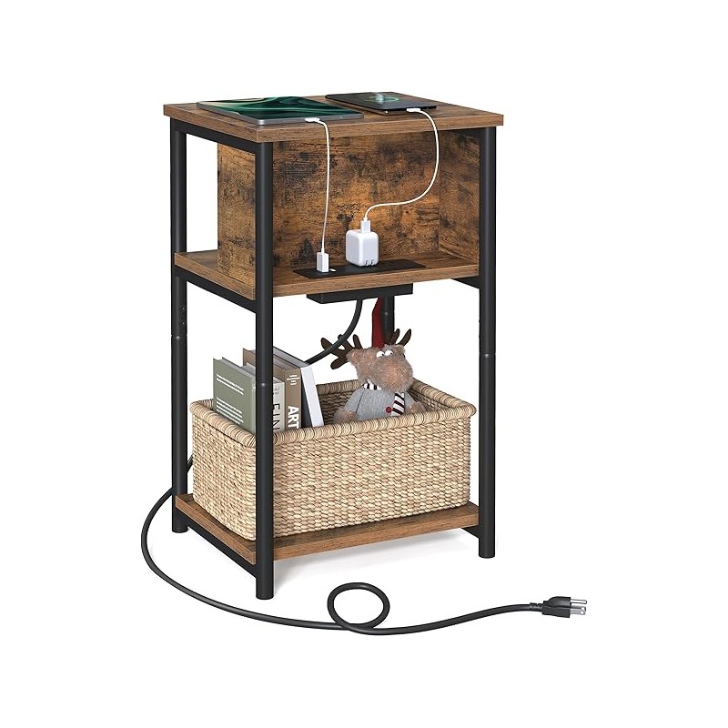 VASAGLE Side Table with Charging Station, 3-Tier End Table with USB Ports and Outlets, Nightstand for Living Room, Bedroom, 11.8 x 13.4 x 22.8 Inches, Plug-in Series, Rustic Brown and Black