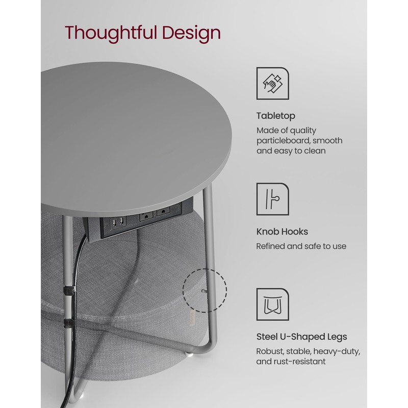 VASAGLE Side Table with Charging Station, Round End Table With Fabric Basket, Nightstand with Power Outlets USB Ports, for Living Room, Bedroom, Modern, Dove Gray and Slate Gray ULET228G01