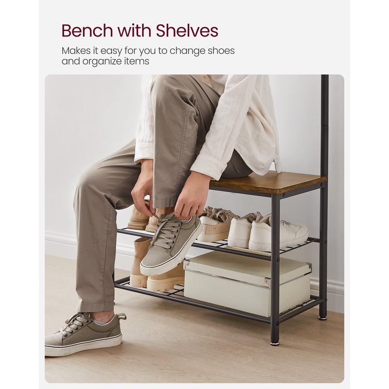 VASAGLE Coat Rack, Hall Tree with Shoe Storage Bench, Entryway Bench with Shoe Storage, 3-in-1, Steel Frame, for Entryway, 12.6 x 27.6 x 68.9 Inches, Industrial, Rustic Brown and Black UHSR41BX