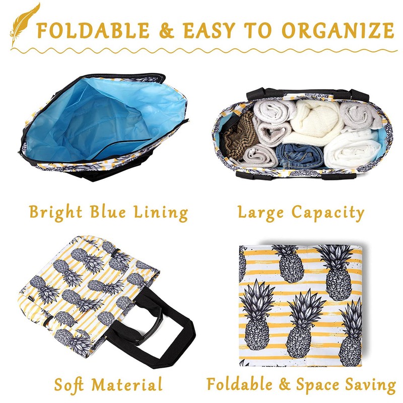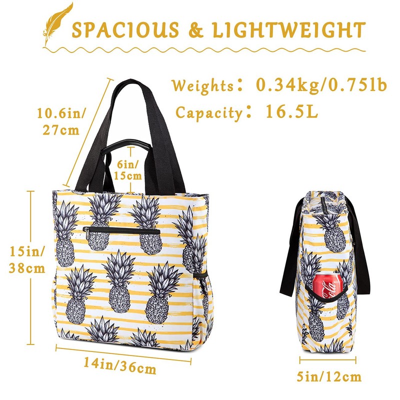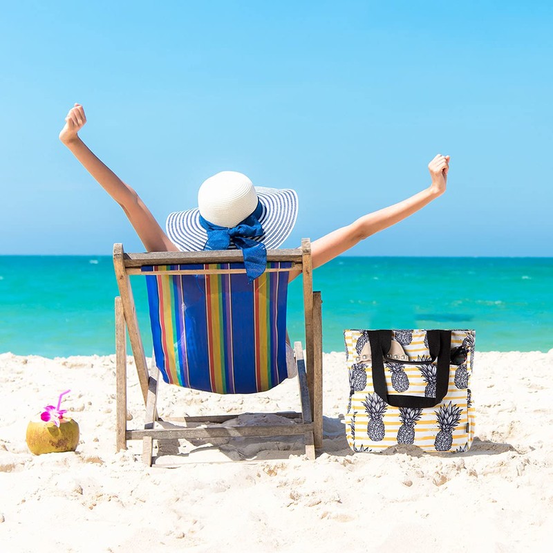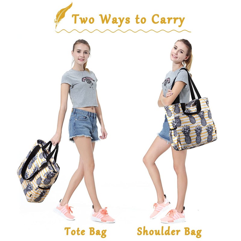 VASCHY Beach Tote Bag for Women, Lightweight Water Resistant Fold-able Large Tote Bag w Zipper for Vocation Cute Pineapple