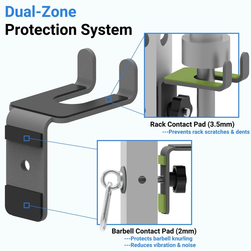 - ✅ 【HEAVY-DUTY BUILD & EQUIPMENT PROTECTION】The holder is constructed from heavy-duty, powder-coated steel to effortlessly support the weight of a standard Olympic barbell. To prevent any damage, we’ve included two layers of protection: a thick 3mm adhesive polymer pad guards your power rack from scratches during installation and adjustment, while a 3mm cushioned liner inside the holder protects your barbell’s delicate knurling and finish from wear and tear.