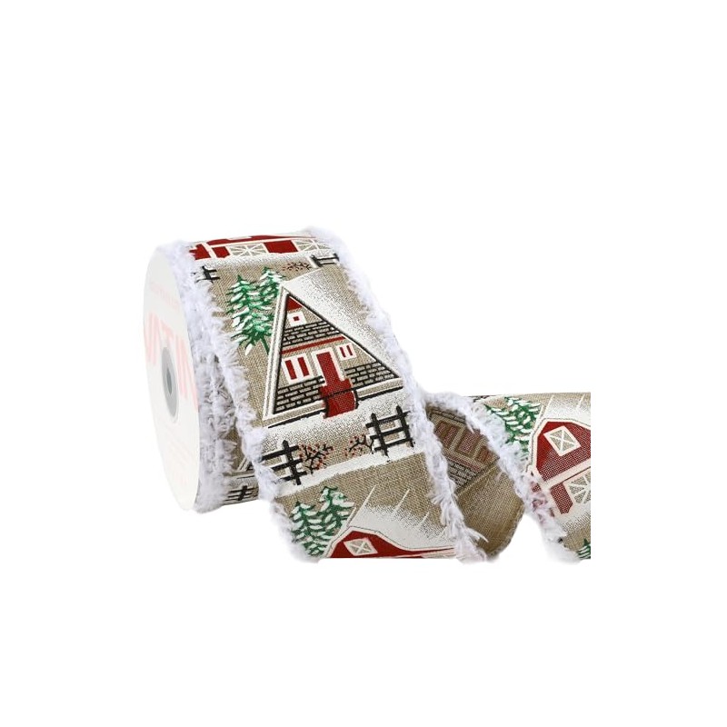 VATIN Christmas Ribbon, Natural Linen-Look Fabric, 2.5 inch Width, Tree and House Pattern, Holiday Decorative Trim