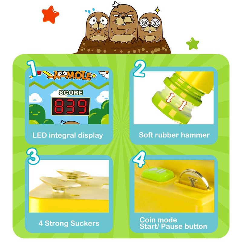 - ✨【REALISTIC ELECTRONIC ARCADE GAME EXPERIENCE】The Pounding game includes 2 modes: trial play mode and coin mode. Electronic health points display and scorer, authentic sound effects, cute moles, just like the original game. There are several levels, each advancing a level, the difficulty will be increased. Quickly start the game, challenge the king of the Whac game
