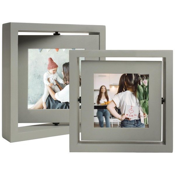 VAUWINEK 4x4 Double-Sided Rotating Floating Square Picture Frames (2 Pack, Gray), Solid Pine Wood with Real Glass for Horizontal Vertical Standing Display Desk Tabletop Photo Frames